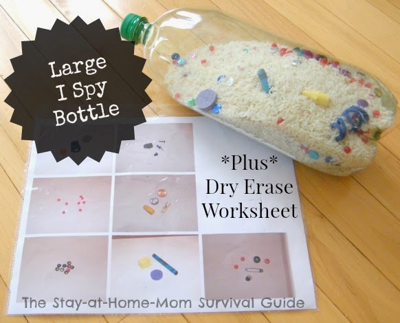 We used a 2-liter bottle to create a jumbo-sized bottle for some ‘I Spy’ fun. I used simple things found around our home: a safety pin, crayon, pencil eraser, beads, small foam shape, coins, rocks, pom poms, pipe cleaner twisted into a small spiral, etc. You don’t need to go out and buy little do-dads. Check around the house: even a Lego brick, or a googly eye will work!