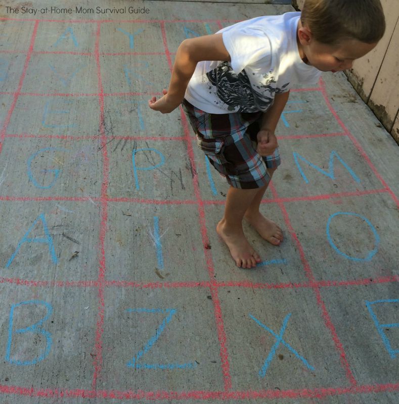 My children are exposed to learning how to spell their names from birth-no kidding! I shared with you previously the personalized song I use to teach my children to spell their names. That song is a great add-on to this hopscotch spelling activity. Let’s get to the activity!First, we drew a square on the ground.
